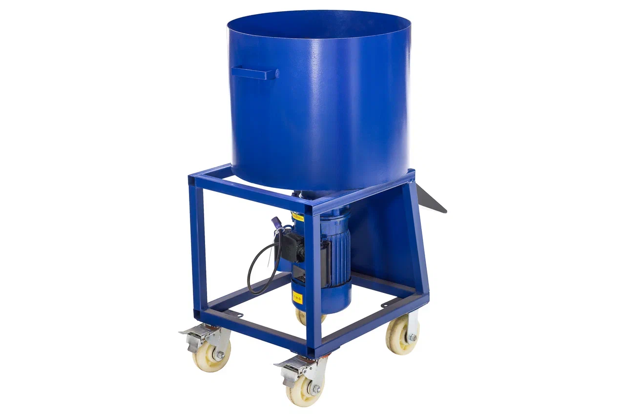 Миксер с электроприводом для производства резиновых покрытий. Перемешивает резиновую крошку, полиуретановое связующее и пигменты в однородную массу за 5 минут. Максимально допустимая разовая загрузка — 90 кг.
